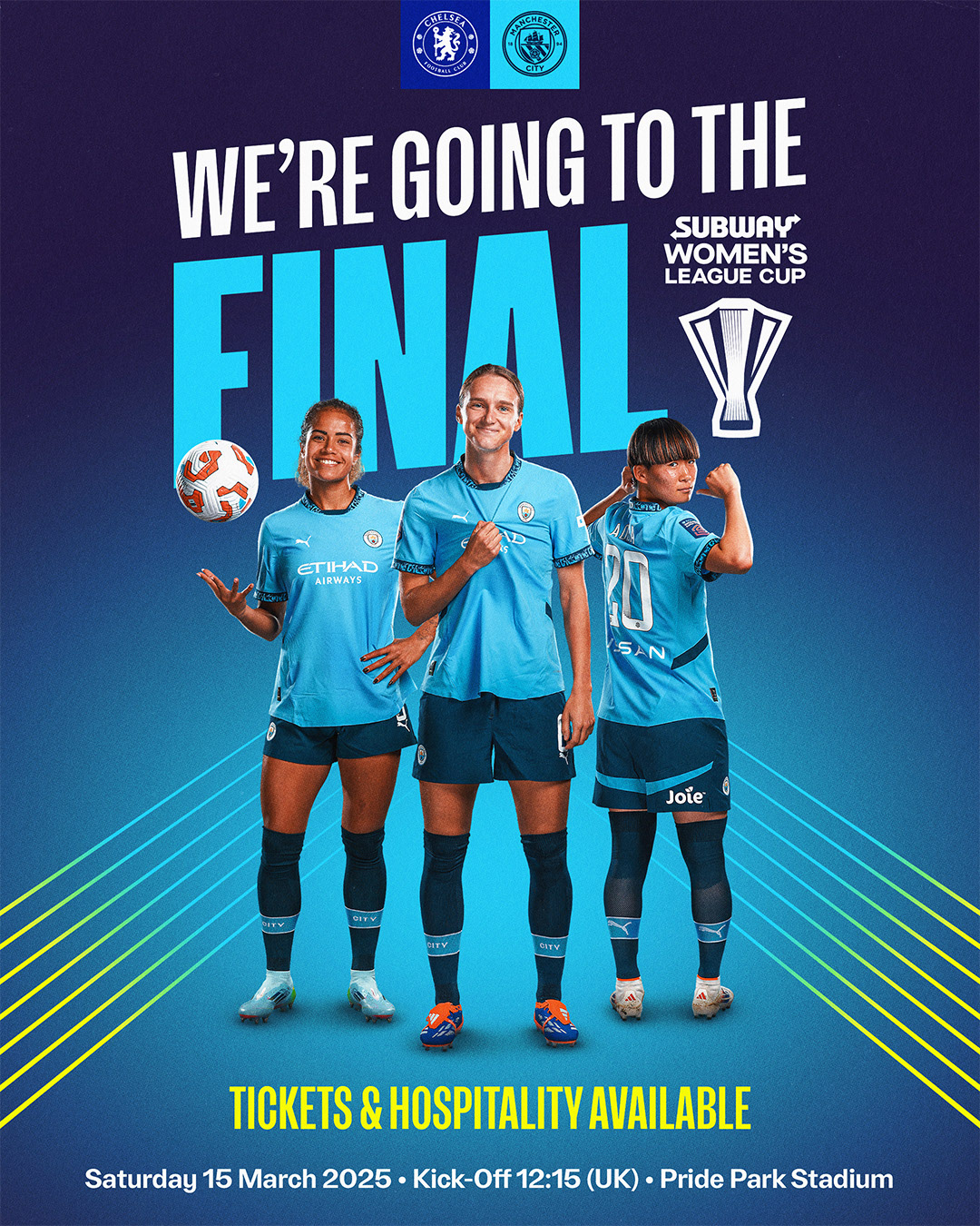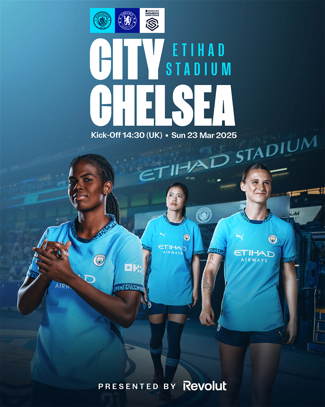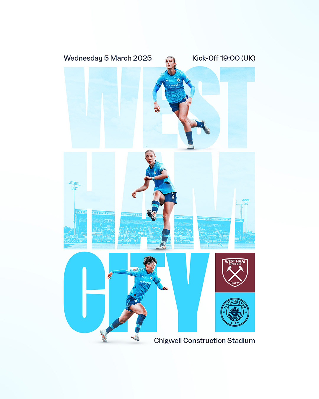 This season the women's team played three games at the Etihad Stadium. I was tasked with designing bespoke imagery for each fixture, then rolling out the campaign to a variety of digital, print, and paid media platforms.